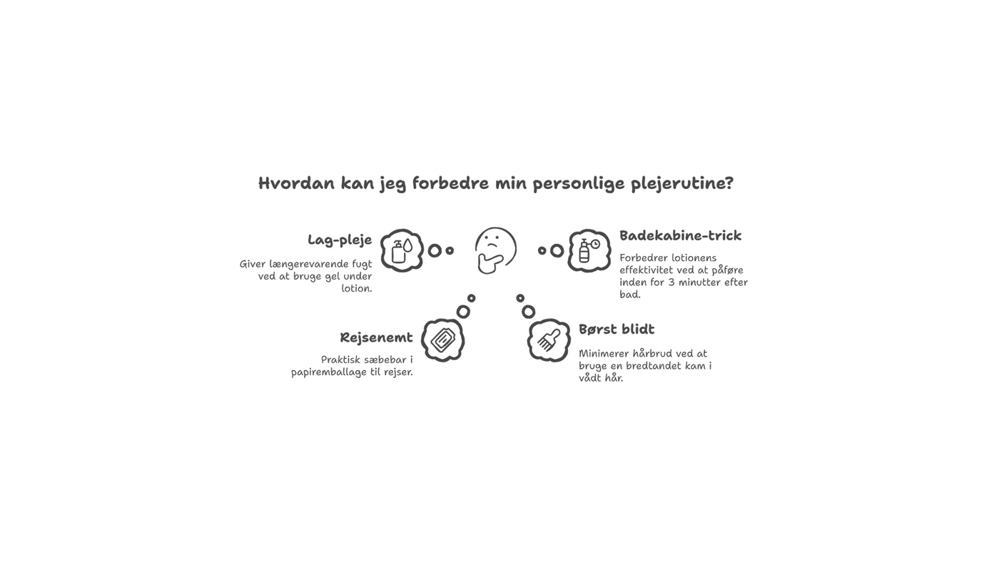 - Placer Flydende håndsæbe ved vasken og Håndcreme i tasken eller på skrivebordet, så det er let at genfugte ofte.