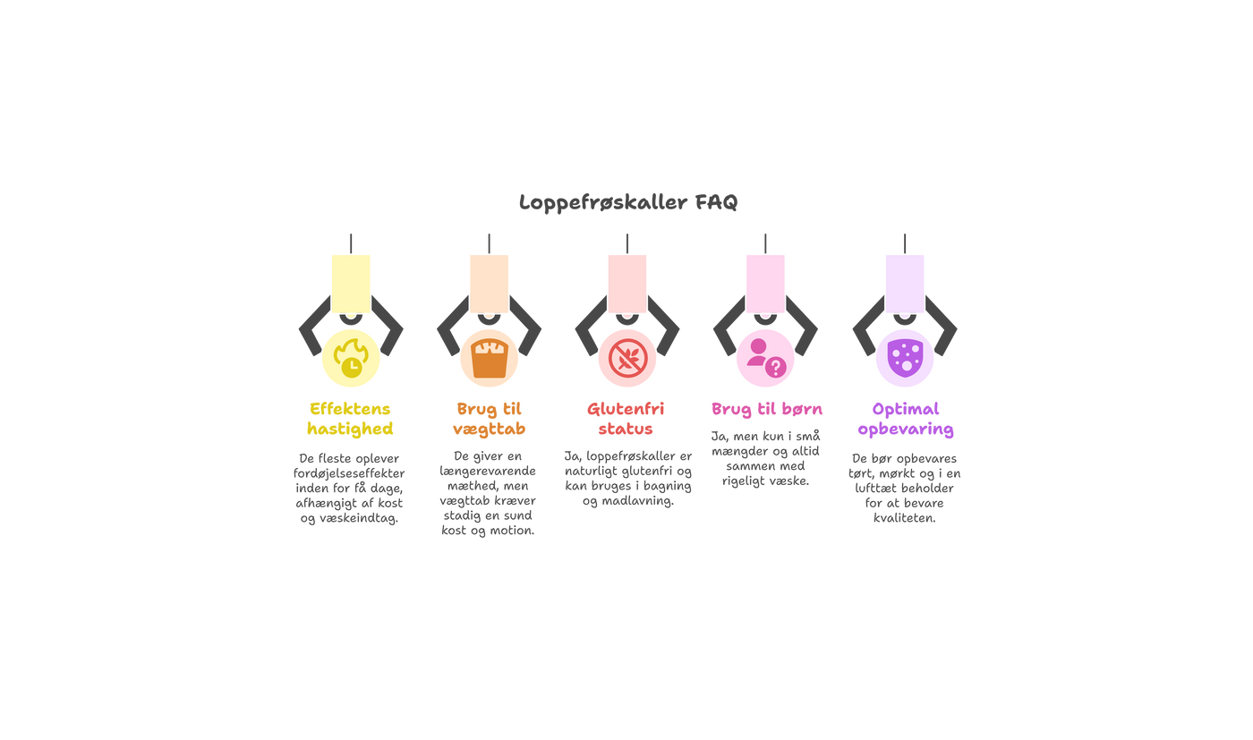 Loppefrøskaller er sikre for de fleste, men hvis man pludselig øger sit fiberindtag meget, kan det give bivirkninger som luft i maven, oppustethed eller midlertidige mavekneb. Disse gener aftager normalt, når kroppen vænner sig til fibrene.