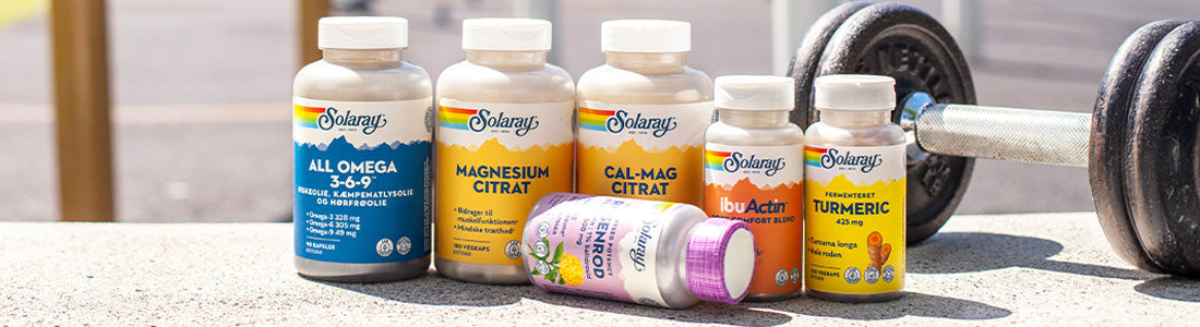 Når kroppen skal yde, restituere og holde balancen, kan det give mening at støtte den med velvalgte næringsstoffer. På billedet her ser du en række Solaray-produkter, som tilsammen dækker både muskler, knogler, hjerte og generel velvære.