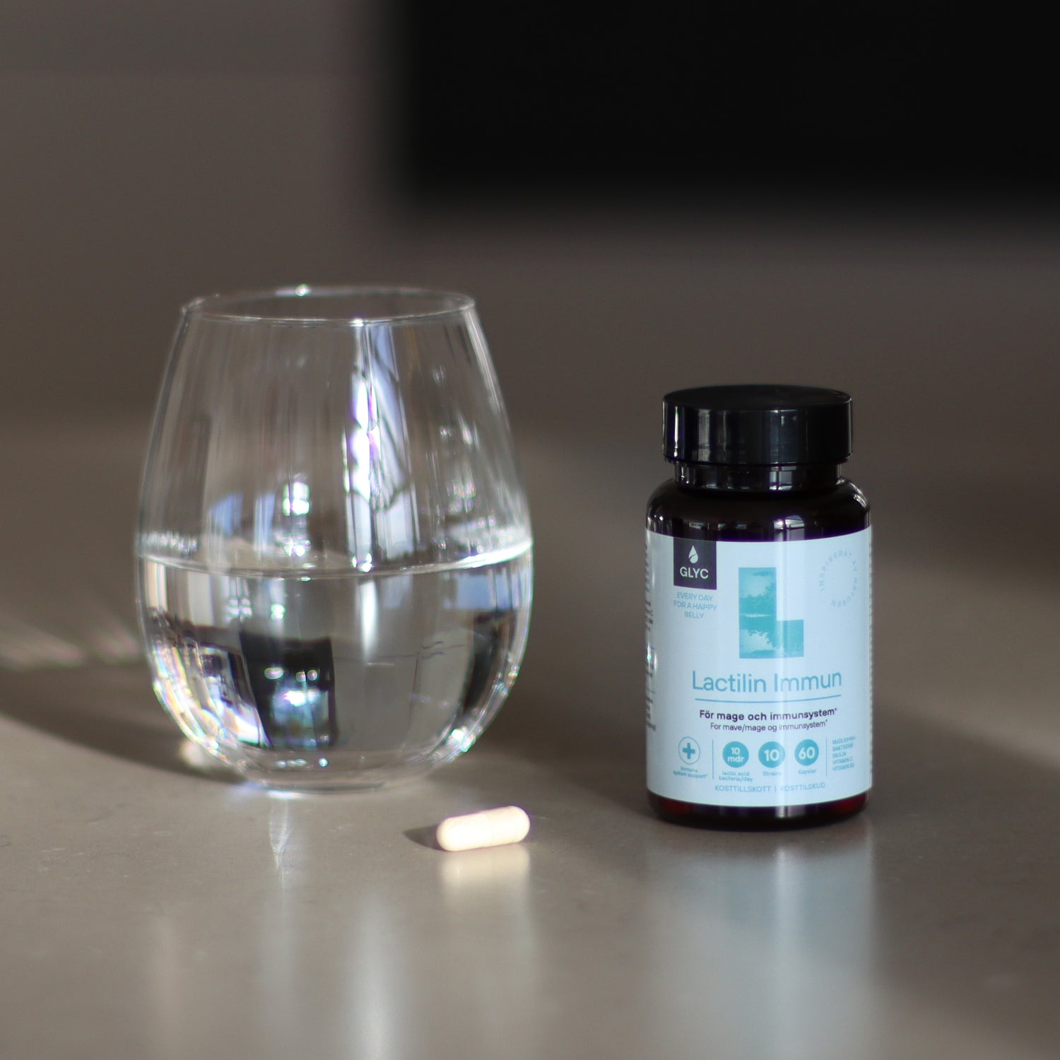 GLYC Lactilin Immun indeholder mælkesyrebakterier af 10 forskellige stammer, vitamin C, riboflavin og calcium.