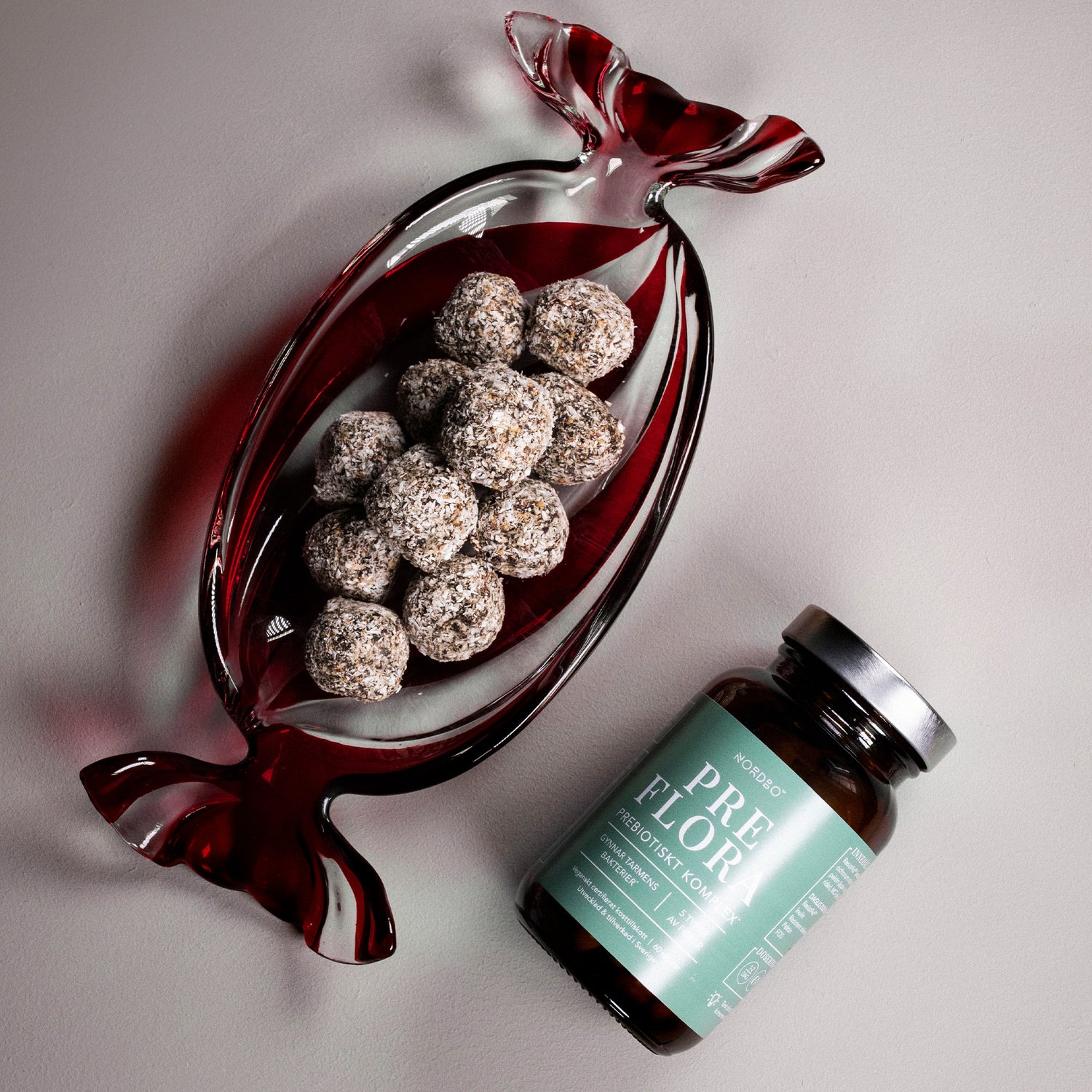 3 gode grunde til at tage PreFlora:1. Fiberblanding af arabinogalaktan, inulin, fruktooligosackarider (FOS), resistent stivelse og pektin.2. Et godt supplement til NORDBO LactiKvinde og LactiTotal.3. Fremstillet i Sverige og vegansk certificeret af Djurens Rätt (Dyrenes Værn)
