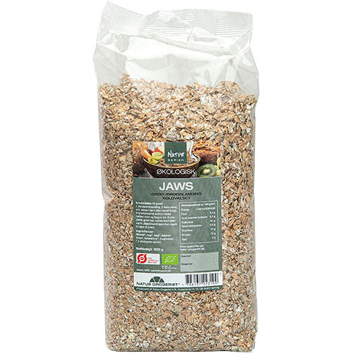 Økologisk Jaws er en lækker koldvalset kornblanding af hvede, rug, byg, havre, hirse, sesamfrø og boghvede. Velegnet til grød og brødbagning.