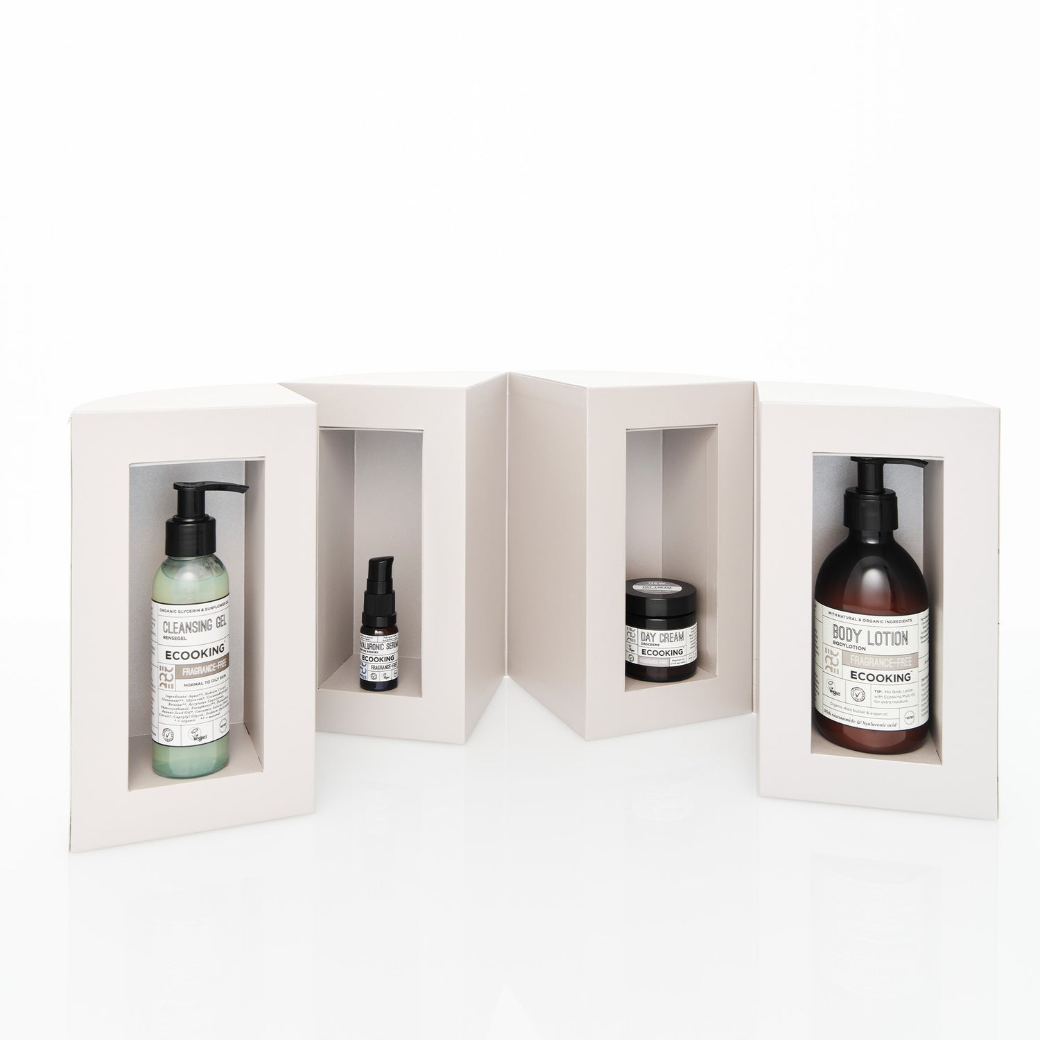 Adventskalenderen består af fire allergivenlige, parfumefri og veganske produkter, der kan anvendes af alle hudtyper.