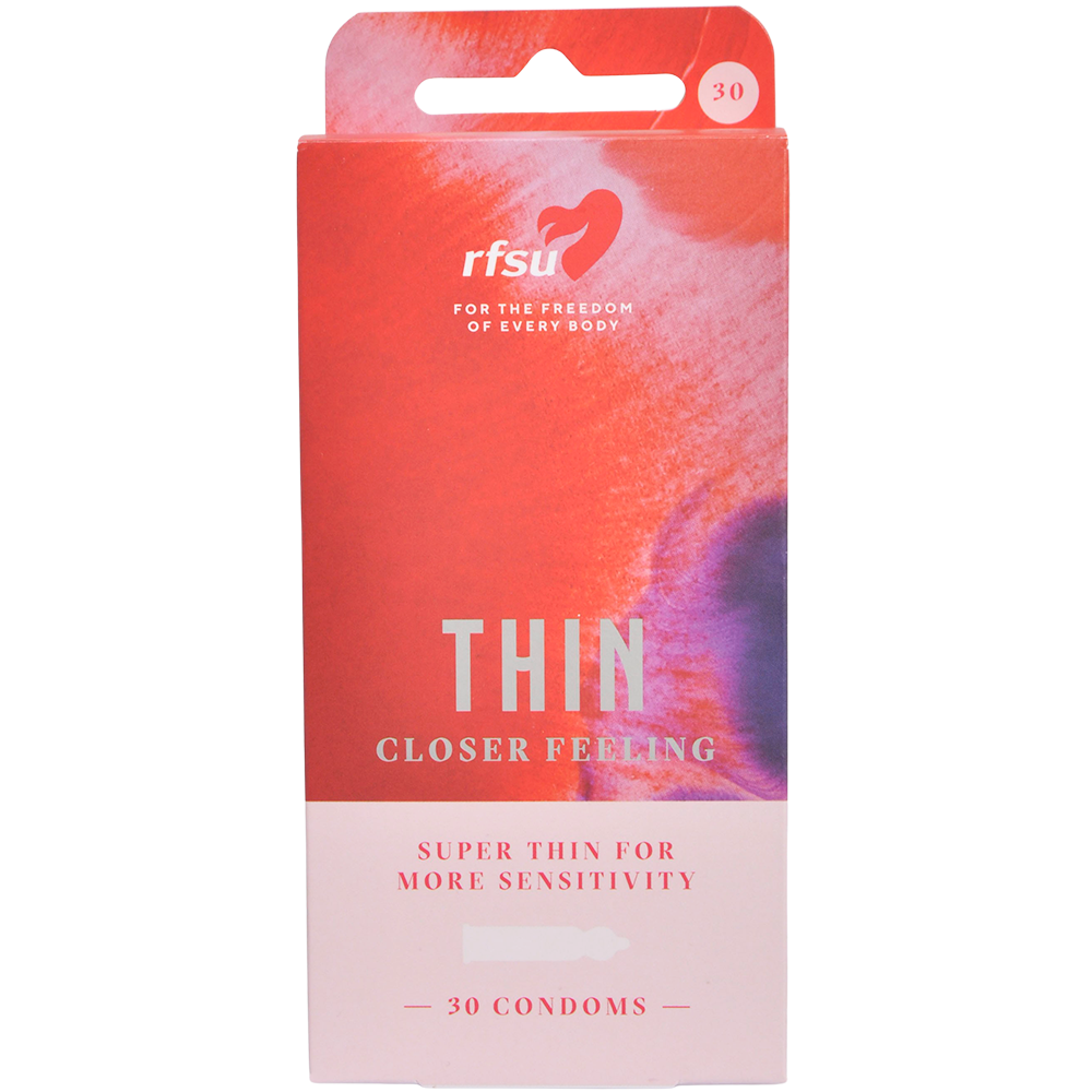 RFSU Thin kondom er et ekstra tyndt kondom, som giver en utroligt naturlig følelse for både ham og hende. Thin kondomet er for dig der ønsker en tæt og naturlig følelse. Kondomet er ekstra tyndt og med afrundet top, som giver en perfekt pasform. RFSU Thin er et latex kondom, fri for farve og med silikone glidecreme.