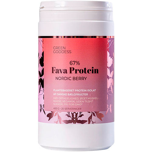 Green Goddess Nordic Berry er et vegansk proteinpulver baseret på favabønne-isolat fra dansk dyrkede favabønner. Produktet er udviklet, fremstillet og pakket i Danmark.